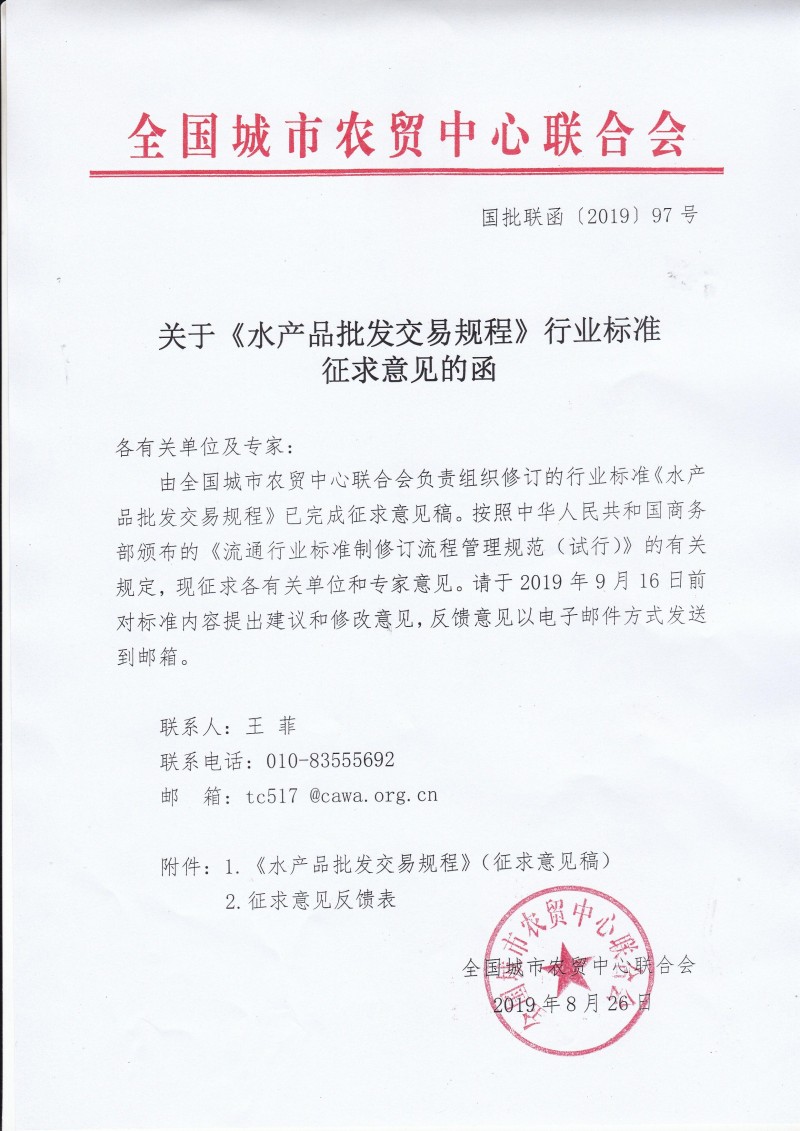 全國城市農貿中心聯合會關于《水產品批發交易規程》行業標準征求意見的函(國批聯函(2019)97號)