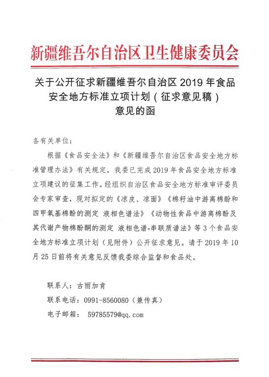 新疆維吾爾自治區衛生健康委員會關于公開征求新疆維吾爾自治區2019年食品安全地方標準立項計劃(征求意見稿)意見的函