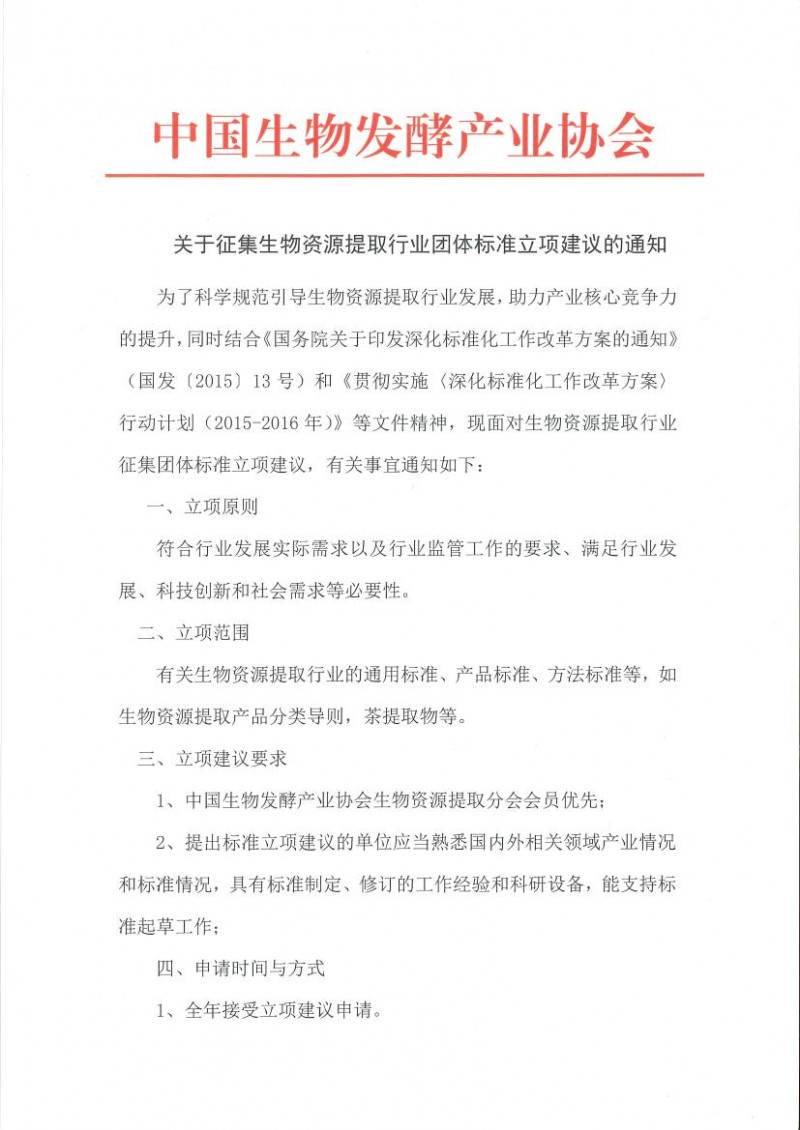 下載中心首頁 » 動(dòng)態(tài)公告 » 標(biāo)準(zhǔn)動(dòng)態(tài) » 中國生物發(fā)酵產(chǎn)業(yè)協(xié)會(huì)關(guān)于征集生物資源提取行業(yè)團(tuán)體標(biāo)準(zhǔn)的通知