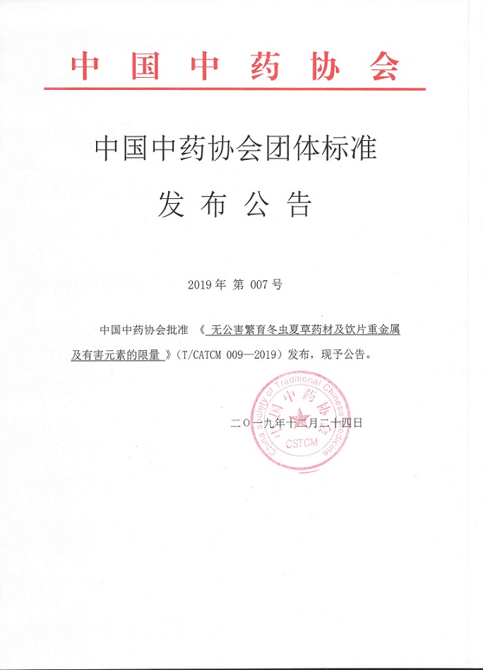 中國中藥協會批準《無公害繁育冬蟲夏草藥材及飲片重金屬及有害元素的限量》(T/CATCM 009—2019)發布(2019年第007號)