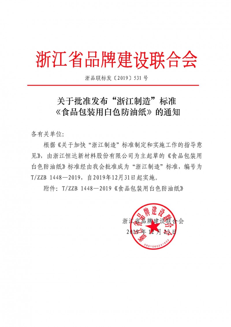 浙江省品牌建設聯合會關于批準發布“浙江制造”標準《食品包裝用白色防油紙》的通知(浙品聯標發〔2019〕531號)