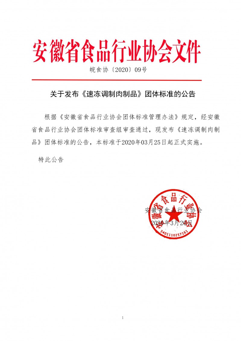 安徽省食品行業協會關于發布《速凍調制肉制品》團體標準的公告(皖食協〔2020〕09號)