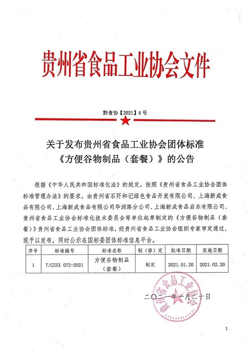 | 1 | T/GZSX 072-2020 | 方便谷物制品(套餐) | 制定 | 2021.01.20 | 2021.02.20 |