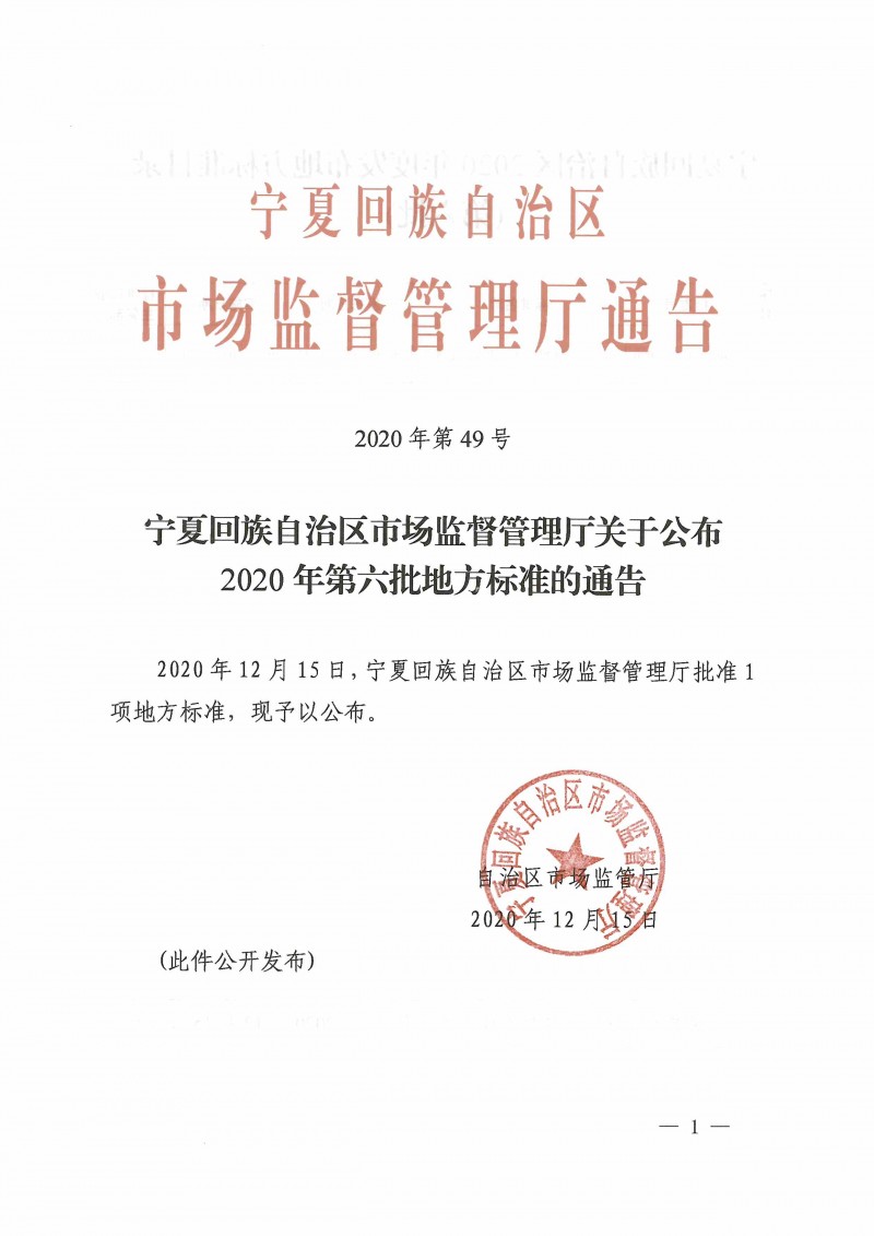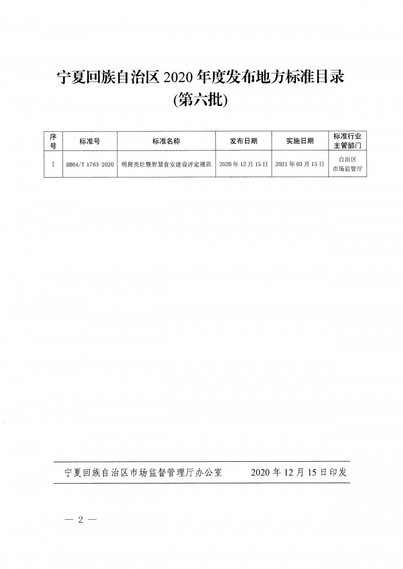 寧夏回族自治區市場監督管理廳關于公布2020年第六批地方標準《明廚亮灶暨智慧食安建設評定規范》的通告(2020年第49號)