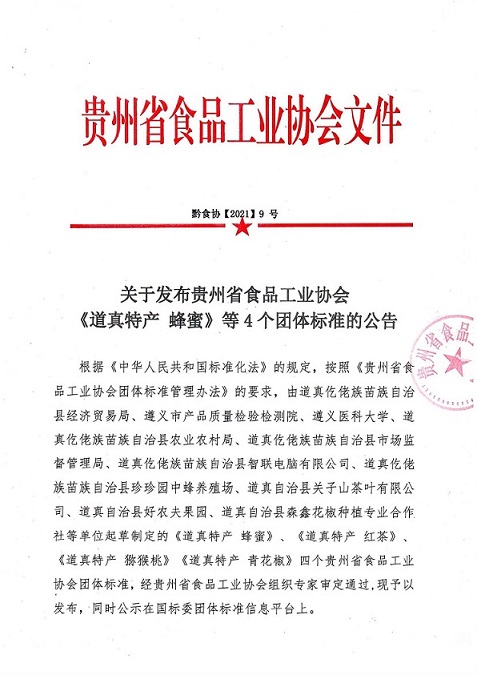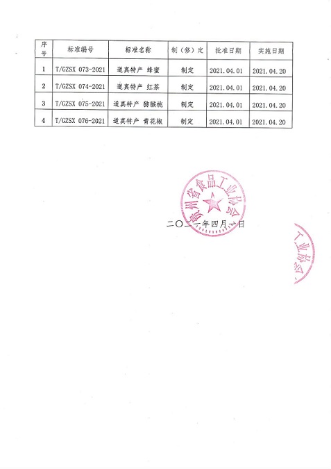 | 1 | T/GZSX 073-2021 | 道真特產 蜂蜜 | 制定 | 2021.04.01 | 2021.04.20 |