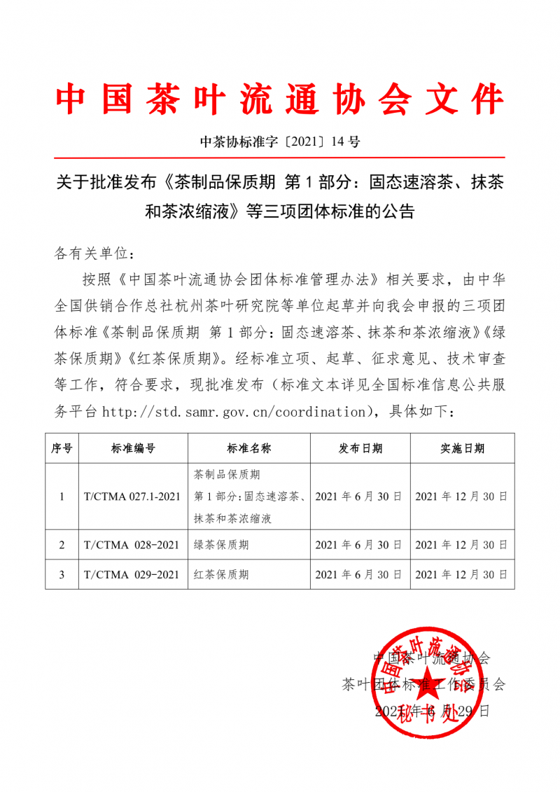 中國茶葉流通協會關于批準發布《茶制品保質期 第1部分:固態速溶茶、抹茶和茶濃縮液》等三項團體標準的公告(中茶協標準字[2021]14號)