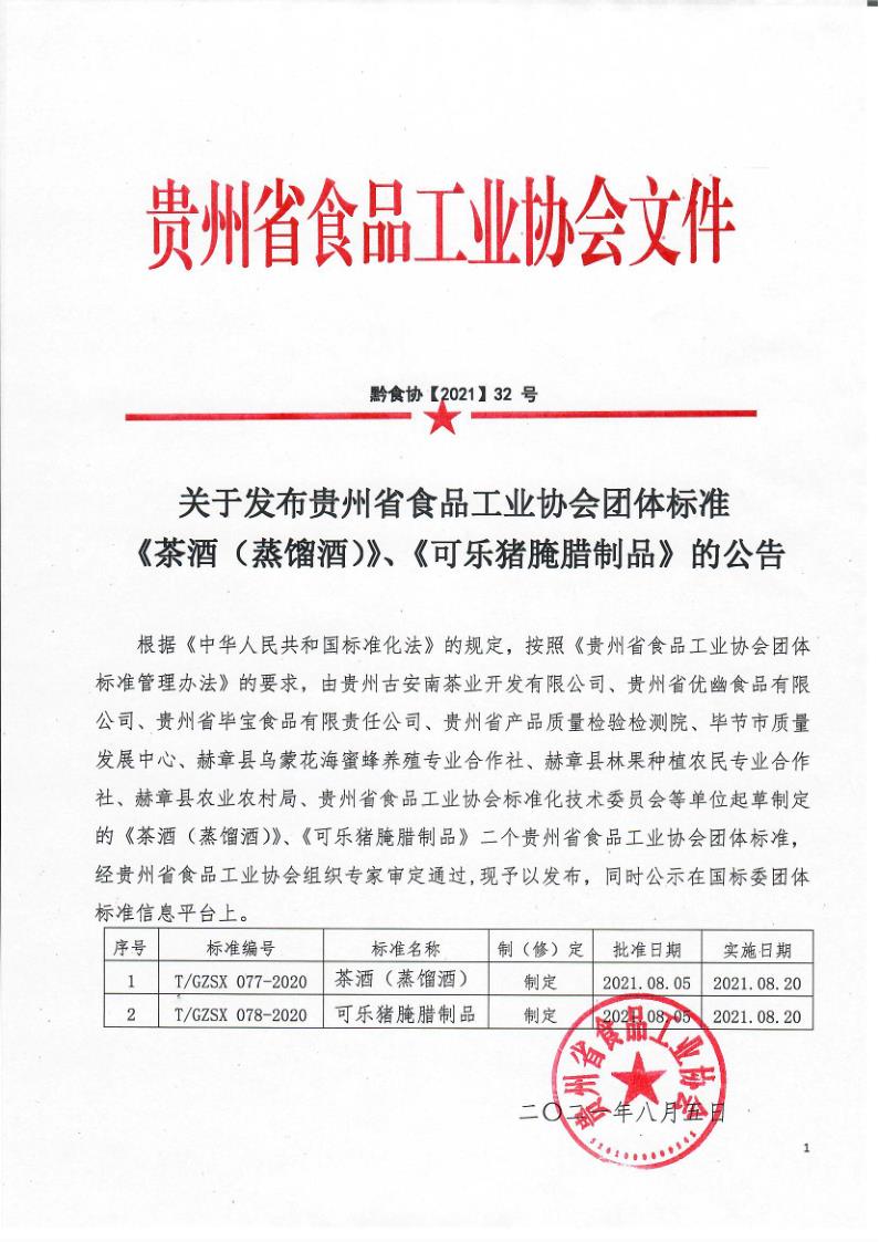 貴州省食品工業協會關于發布《茶酒(蒸酒)》、《可樂豬腌臘制品》兩項團體標準的公告(黔食協【2021】32號)