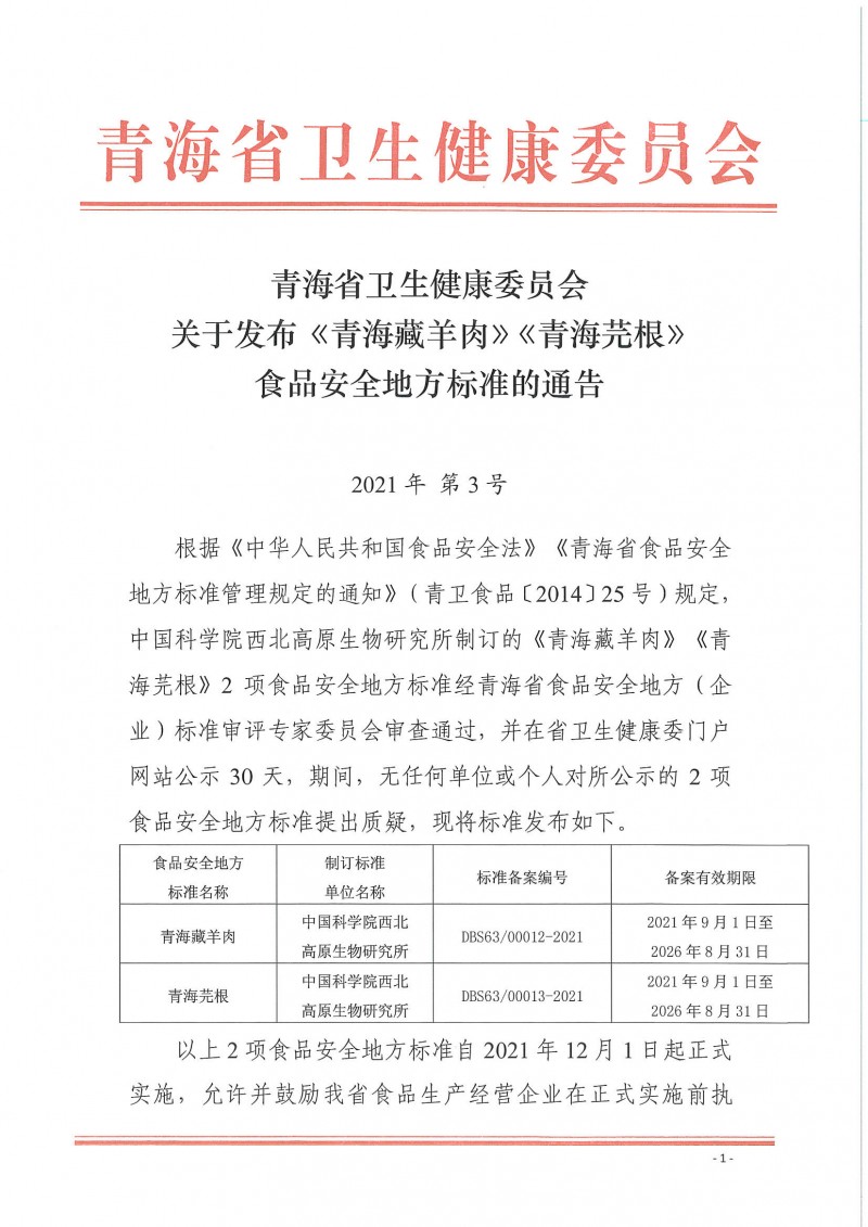 青海省衛(wèi)生健康委員會(huì)關(guān)于發(fā)布《青海藏羊肉》《青海芫根》食品安全地方標(biāo)準(zhǔn)的通告(2021年第3號(hào))