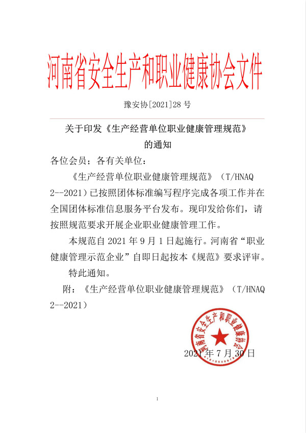 下載中心首頁 » 動態公告 » 標準公告 » 河南省安全生產和職業健康協會關于印發《生產經營單位職業健康管理規范》的通知(豫安協[2021]28號)