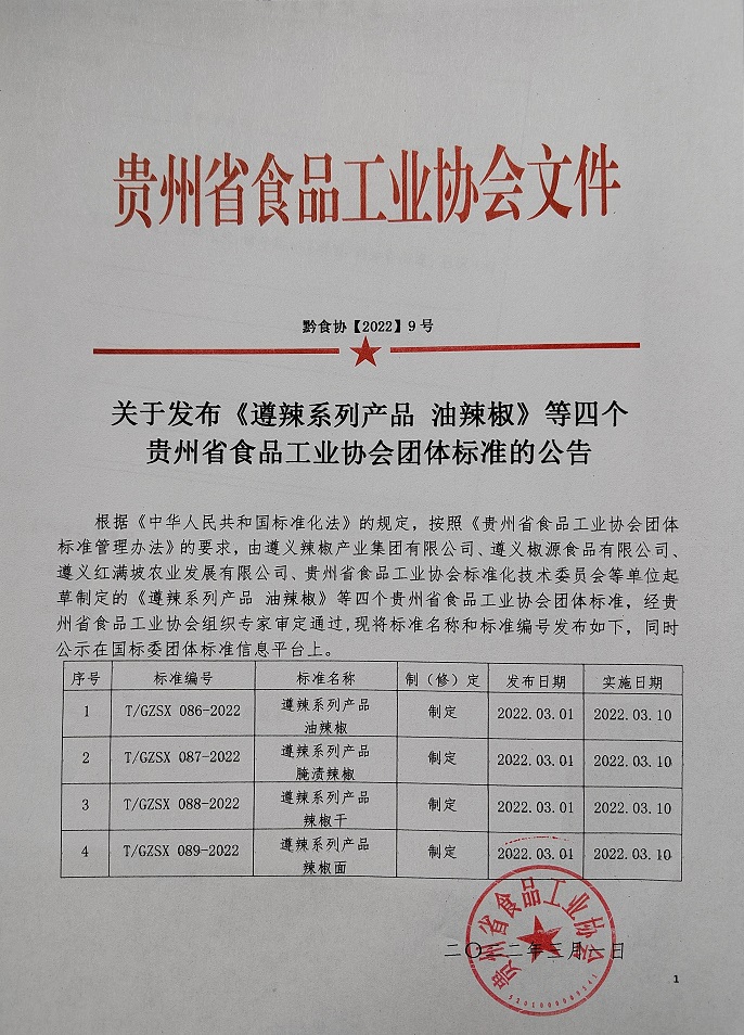 根據《中華人民共和國標準化法》的規定,按照《貴州省食品工業協會團體標準管理辦法》的要求,由遵義辣椒產業集團有限公司、遵義椒源食品有限公司、遵義紅滿坡農業發展有限公司、貴州省食品工業協會標準化技術委員會等單位起草制定的《遵辣系列產品 油辣椒》等四個貴州省食品工業協會團體標準,經貴州省食品工業協會組織專家審定通過,現將標準名稱和標準編號發布如下,同時公示在國標委團體標準信息平臺上。