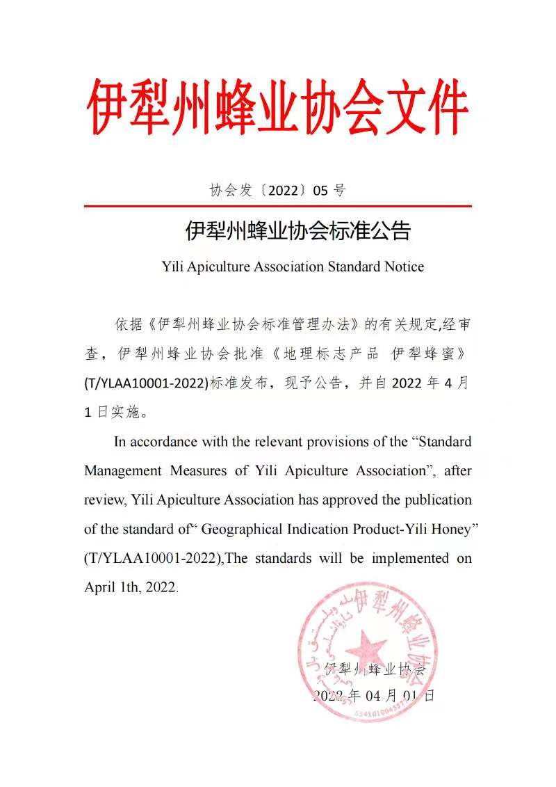 依據《伊犁州蜂業協會標準管理辦法》的有關規定,經審查,伊犁州蜂業協會批準《地理標志產品伊犁蜂蜜》(T/YLAA10001-2022)標準發布,現予公告,并自2022年4月1日實施。