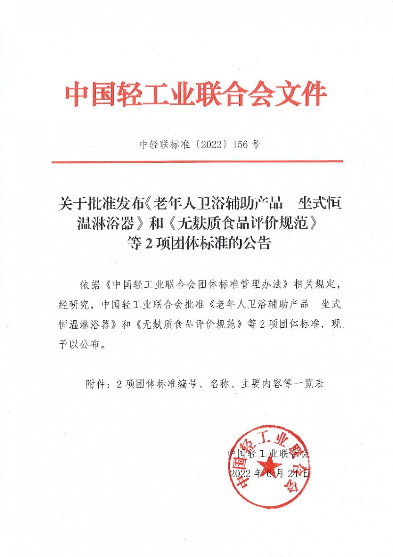 核心提示:中國輕工業聯合會關于批準發布《老年人衛浴輔助產品 坐式恒溫淋浴器》和《無麩質食品評價規范》等2項團體標準的公告(中輕聯標準[2022]156號)