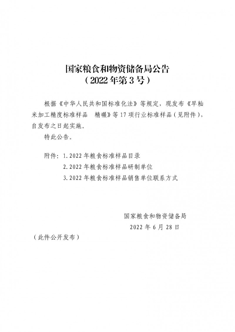 下載中心首頁 » 動態公告 » 標準公告 » 國家糧食和物資儲備局公告(2022年第3號)|發布《早秈米加工精度標準樣品 精碾》等17項行業標準樣品
