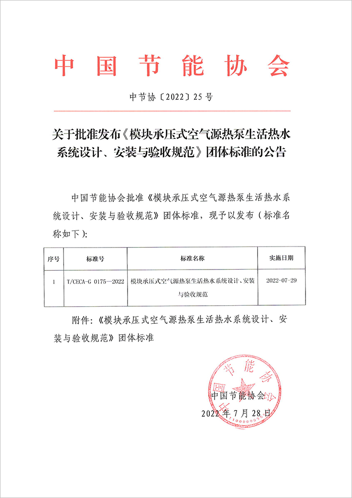 關(guān)于批準(zhǔn)發(fā)布《模塊承壓式空氣源熱泵生活熱水系統(tǒng)設(shè)計(jì)、安裝與驗(yàn)收規(guī)范》團(tuán)體標(biāo)準(zhǔn)的公告.PDF