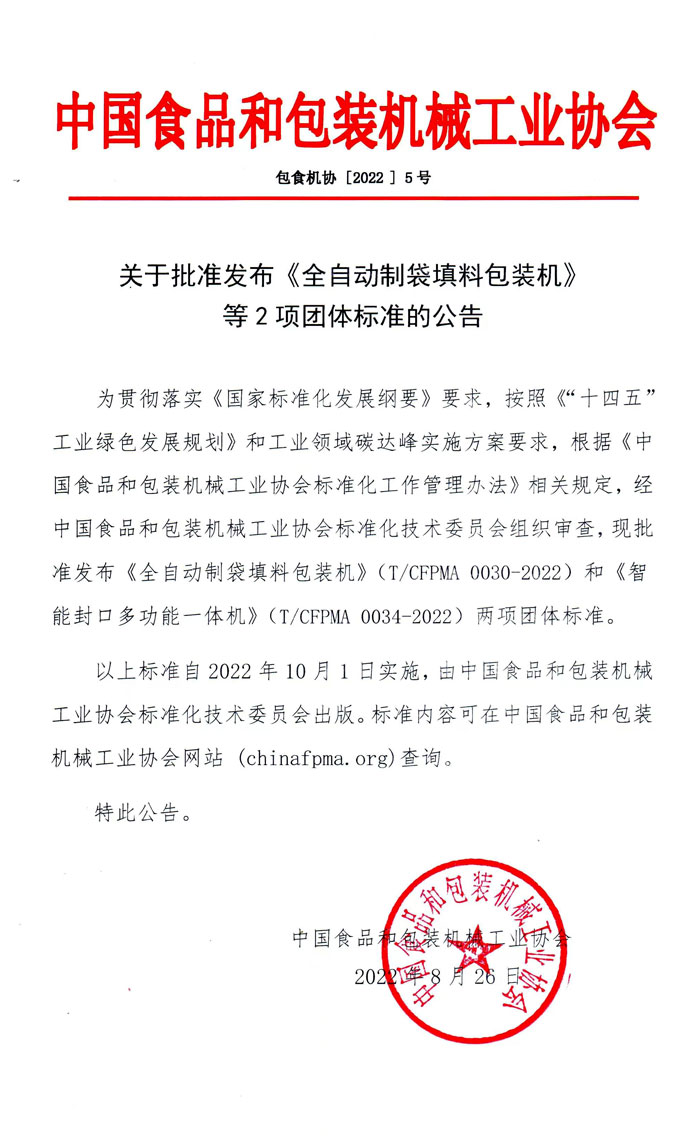 T/CFPMA 0030-2022 全自動(dòng)制袋填料包裝機(jī)