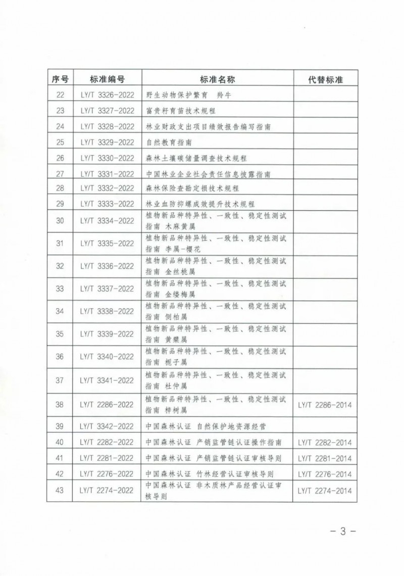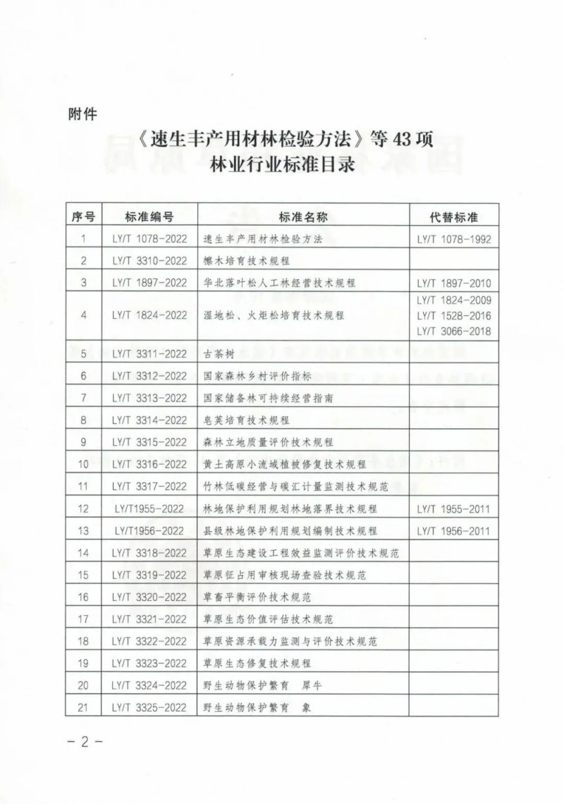 國(guó)家林業(yè)和草原局批準(zhǔn)發(fā)布《速生豐產(chǎn)用材林檢驗(yàn)方法》等43項(xiàng)林業(yè)行業(yè)標(biāo)準(zhǔn)(見(jiàn)附件),自2023年4月1日起實(shí)施。特此公告。