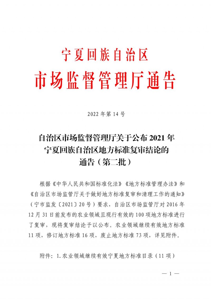 寧夏回族自治區市場監督管理廳關于公布2021年寧夏回族自治區地方標準復審結論的 通告(第二批)(2022年第14號)