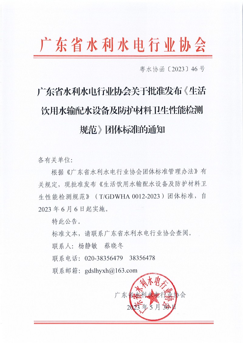 廣東省水利水電行業(yè)協(xié)會(huì)關(guān)于批準(zhǔn)發(fā)布《生活飲用水輸配水設(shè)備及防護(hù)材料衛(wèi)生性能檢測(cè)規(guī)范》團(tuán)體標(biāo)準(zhǔn)的通知(粵水協(xié)函〔2023〕46號(hào))