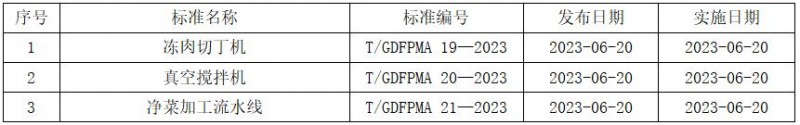 根據《廣東省食品和包裝機械行業協會團體標準制定程序》有關規定,由廣東志偉妙卓智能機械制造有限公司牽頭起草的《凍肉切丁機》、《真空攪拌機》和《凈菜加工流水線》3項團體標準,已通過專家組審查,現予批準發布,標準相關信息如下: