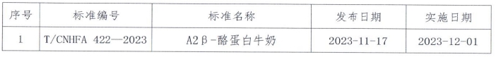 中國營養(yǎng)保健食品協(xié)會(huì)批準(zhǔn)發(fā)布《A2 β-酪蛋白牛奶》團(tuán)體標(biāo)準(zhǔn)(T/CNHFA 422—2023),現(xiàn)予公告,自2023年12月1日起實(shí)施。