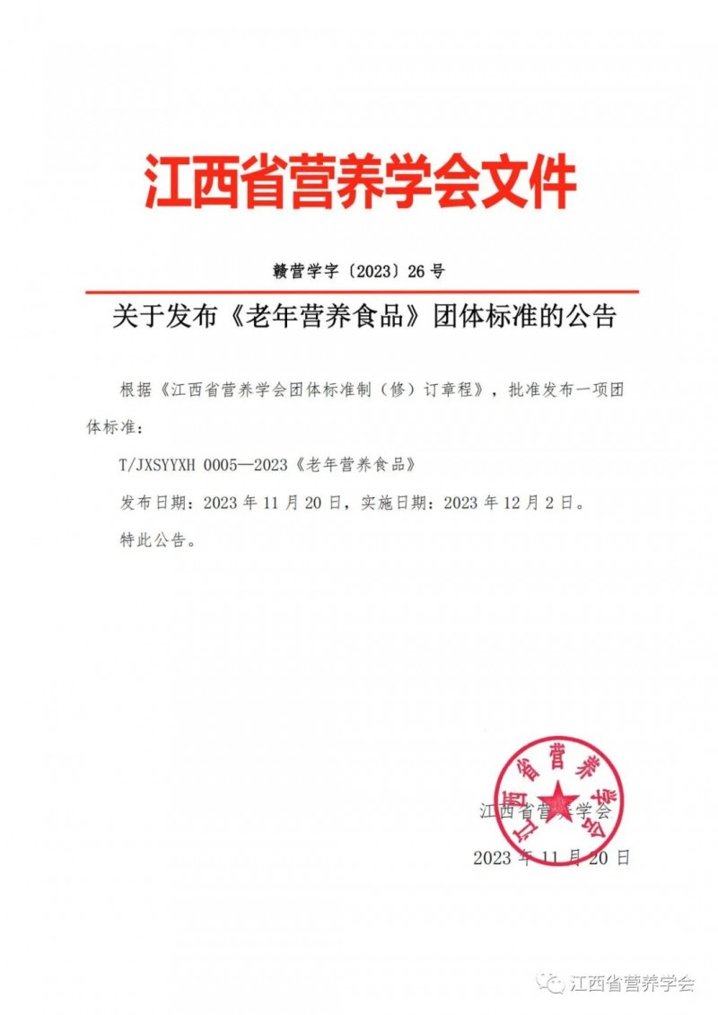 江西省營養學會關于團體標準發布《老年營養食品》的公告(贛營學字〔2023〕26號)
