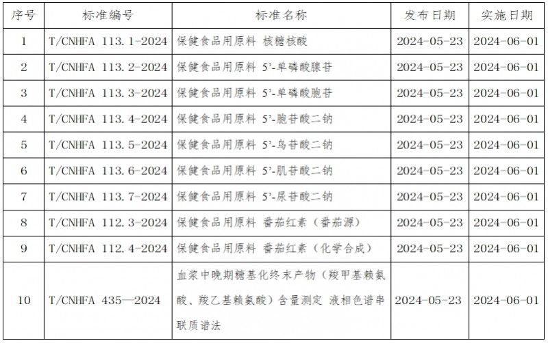 中國營養(yǎng)保健食品協(xié)會批準(zhǔn)發(fā)布《保健食品用核糖核酸》(T/CNHFA 113.1-2024)等10項(xiàng)團(tuán)體標(biāo)準(zhǔn),現(xiàn)予公告,自2024年6月1日起實(shí)施。