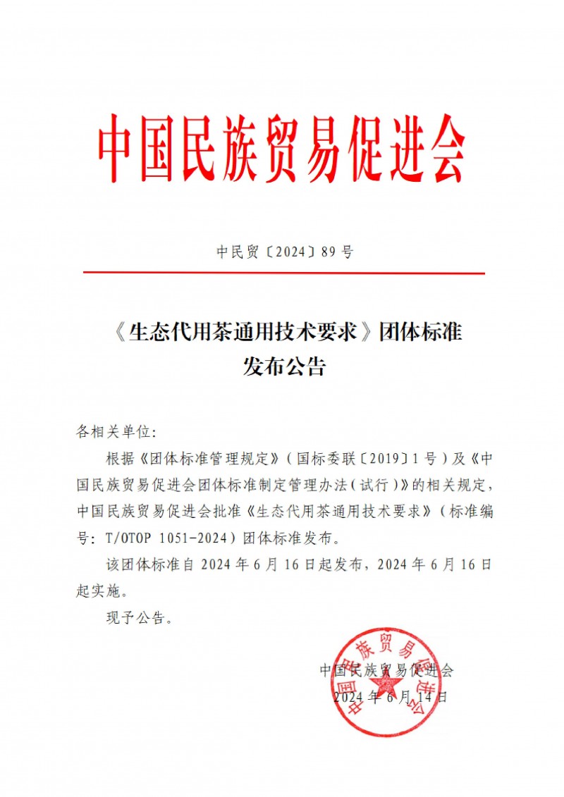 下載中心首頁 » 動態公告 » 標準公告 » 中國民族貿易促進會發布《生態代用茶通用技術要求》團體標準(中民貿[2024]89號)