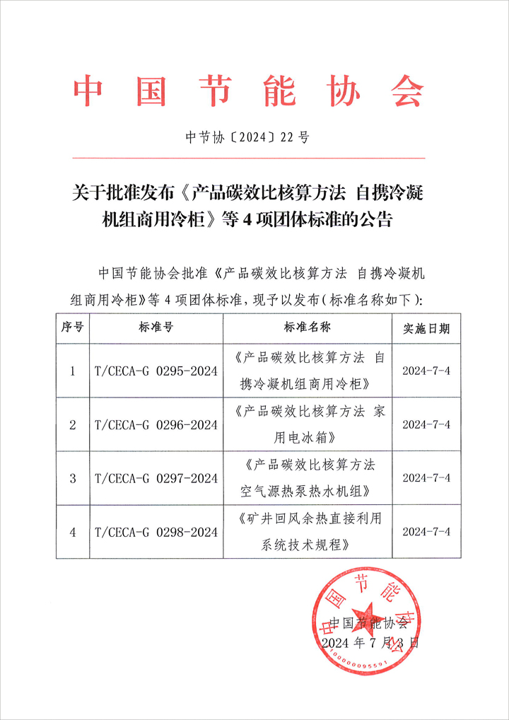 相關標準如下:T/CECA-G 0295-2024 產品碳效比核算方法 自攜冷凝機組商用冷柜
