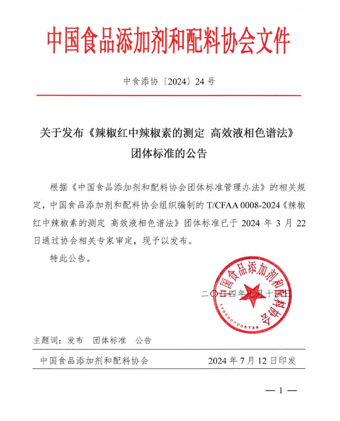 中國食品添加劑和配料協(xié)會關(guān)于發(fā)布《辣椒紅中辣椒素的測定 高效液相色譜法》團體標準的公告(中食添協(xié)[2024]24號)