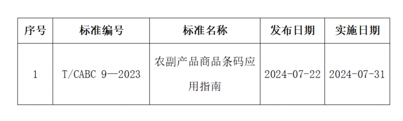 根據《中國條碼技術與應用協會團體標準管理辦法》的有關規定,中國條碼技術與應用協會批準發布《農副產品商品條碼應用指南》團體標準,現予以公布,相關信息如下: