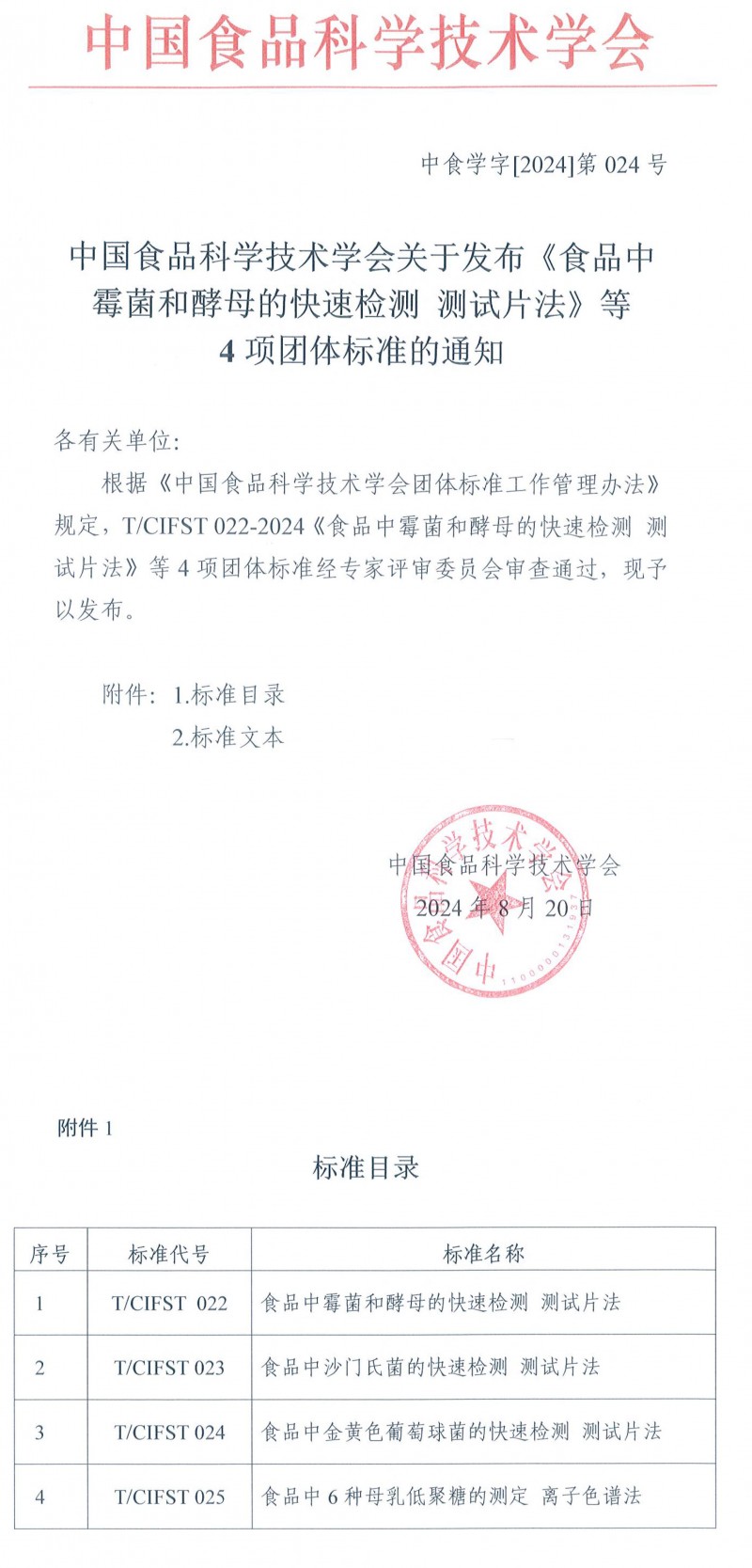 中國食品科學(xué)技術(shù)學(xué)會關(guān)于發(fā)布《食品中霉菌和酵母的快速檢測 測試片法》等4項團體標準的通知(中食學(xué)字[2024]第024號)