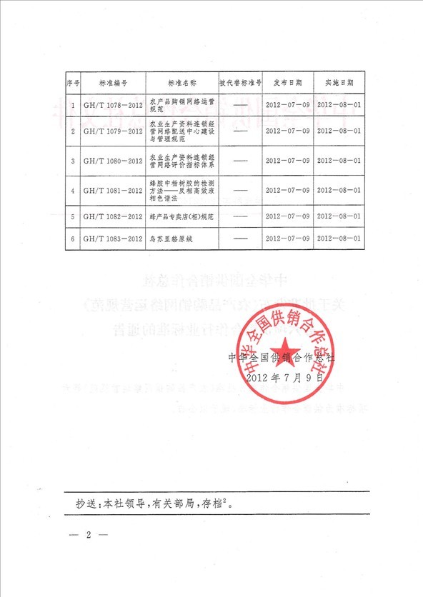 | 5 | GH/T 1082-2012 | 蜂產品專賣店(柜)規范 | —— | 2012-07-09 | 2012-08-01 |
