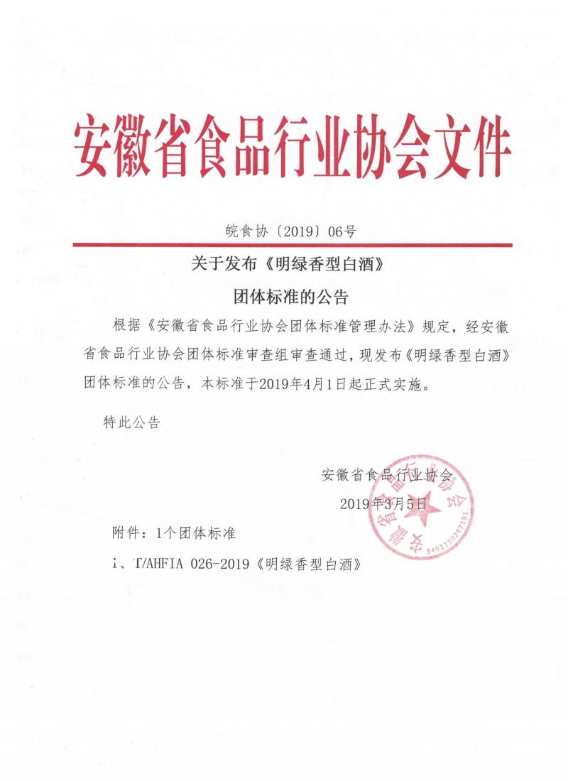 安徽省食品行業協會關于發布《明綠香型白灑》團體標準的公告(皖食協〔2019〕06號)