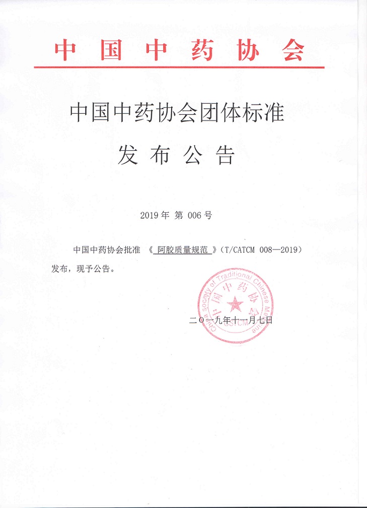 核心提示:中國中藥協會批準《阿膠質量規范》(T/CATCM 008-2019)發布。