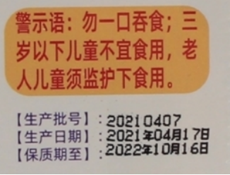 Ø 標(biāo)示內(nèi)容:警示語和食用方法,標(biāo)示為“勿一口吞食;三歲以下兒童不宜食用,老人兒童須監(jiān)護(hù)下食用”。