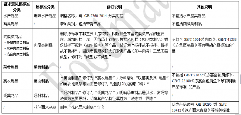 參考市售速凍調(diào)制食品行業(yè)現(xiàn)狀,并結(jié)合現(xiàn)行標(biāo)準(zhǔn)情況,征求意見稿對(duì)標(biāo)準(zhǔn)相關(guān)的產(chǎn)品進(jìn)行了分類,主要修訂情況見表1。