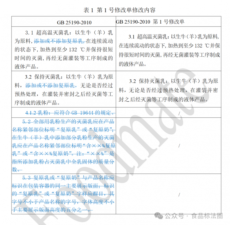 本次修改單刪除“超溫滅菌乳”、“保持滅菌乳”定義中“加或不添加復(fù)原乳 ”的規(guī)定,明確了不再允許使用復(fù)原乳生產(chǎn)滅菌乳。同時(shí)刪除了復(fù)原乳標(biāo)識(shí)的相關(guān)規(guī)定。具體變化比對(duì)情況如下表。