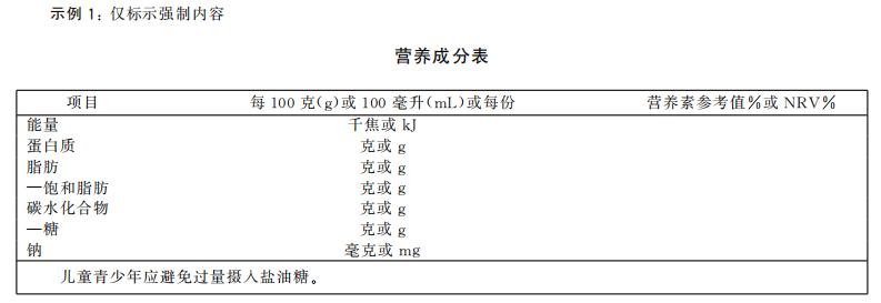 營養成分表中飽和脂肪或飽和脂肪酸應標識在脂肪下方,標示更多營養成分時,強制標示的內容:能量、蛋白質、脂肪、飽和脂肪(或飽和脂肪酸)、碳水化合物、糖和鈉,應采取增大字號、改變字體(如斜體、加粗、加黑)或調整顏色(文字或背景顏色)等形式使之更加醒目。下圖為GB 28050-2025中示例。