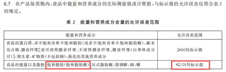 根據GB 28050-2025中6.7的規定,飽和脂肪、飽和脂肪酸實際測量值或計算值與標示值設置了允許誤差范圍上限,實際測量值應≤120%標示值。