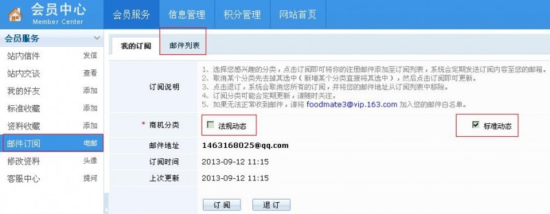 4、可以進行郵件訂閱,勾選“法規動態”或者“標準動態”,訂閱后的信息會在“郵件列表”中顯示出來,方便會員及時查看。