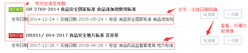 2.標(biāo)準(zhǔn)列表頁:新增了“發(fā)布日期”、“實(shí)施日期”兩個(gè)字段,同時(shí)標(biāo)題左側(cè)新增標(biāo)準(zhǔn)的狀態(tài),還增加了“查看”、“收藏”功能。這樣可以更快速的了解標(biāo)準(zhǔn)的大概情況,想查看更詳細(xì)的內(nèi)容,直接點(diǎn)擊查看也比較方便。