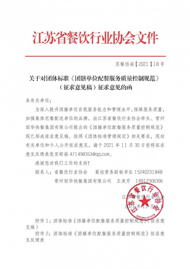 江蘇省餐飲行業協會關于對團體標準《團膳單位配餐服務質量控制規范》(征求意見稿)征求意見的函(蘇餐協函【2021 】18號)