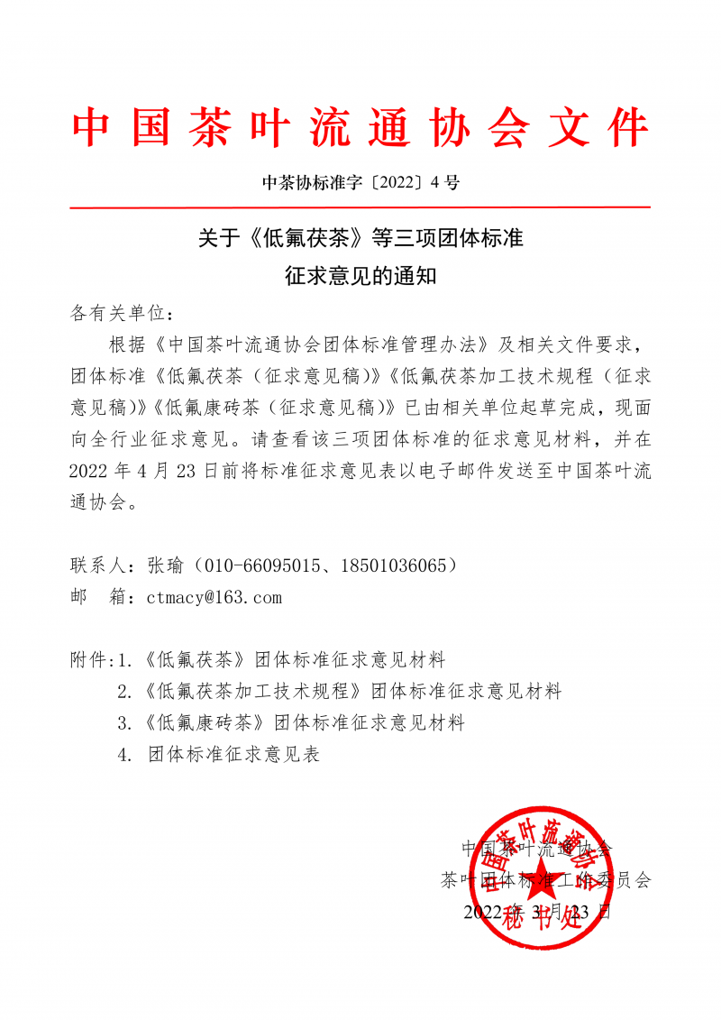 中國(guó)茶葉流通協(xié)會(huì)關(guān)于《低氟茯茶》等三項(xiàng)團(tuán)體標(biāo)準(zhǔn)征求意見(jiàn)的通知(中茶協(xié)標(biāo)準(zhǔn)字〔2022〕4號(hào))